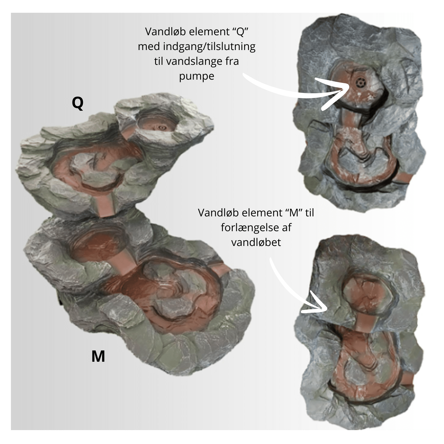 Her som model “Q” som er MED hul/indgang/tilslutning til vandslange fra din pumpe. Q-elementet bruges som start-element på dit vandløb. Vælg model “M” i samme serie såfremt du ønsker at forlænge vandindløbet (se varianter længere nede på siden).
