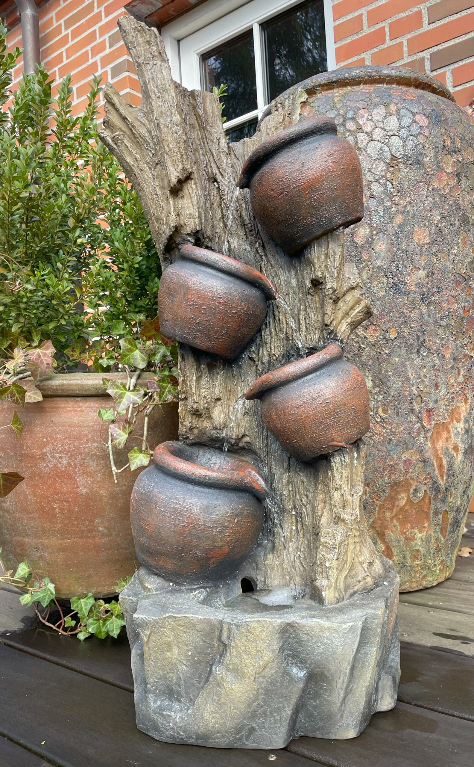 Smuk høj vandfontæne med fire krukker, som vandet cirkulerer igennem. Med indbygget LED lys som gør fontænen til et ekstra smukt element i haven eller ved terrassen på de lune sommeraftener ved mørkets frembrud. Populær model som passer til de fleste udendørs have og terrasse miljøer. Du skal blot påfylde vand på fontænens vandbeholder og sætte strømkablet til en stikkontakt – så risler vandet smukt og fint i fontænen.